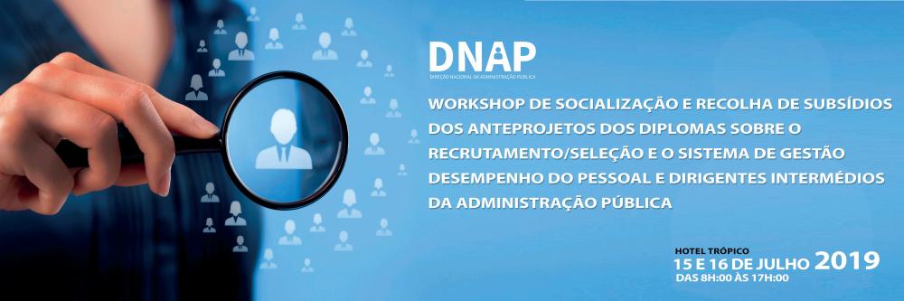 A Direção Nacional da Administração Pública, realiza nos dias 15 e 16 de julho o workshop de socialização e recolha de subsídios dos Anteprojetos dos Diplomas sobre o Recrutamento/Seleção e o Sistema de Gestão Desempenho do Pessoal e Dirigentes Intermédios da Administração Pública, a ter lugar no Hotel Trópico.