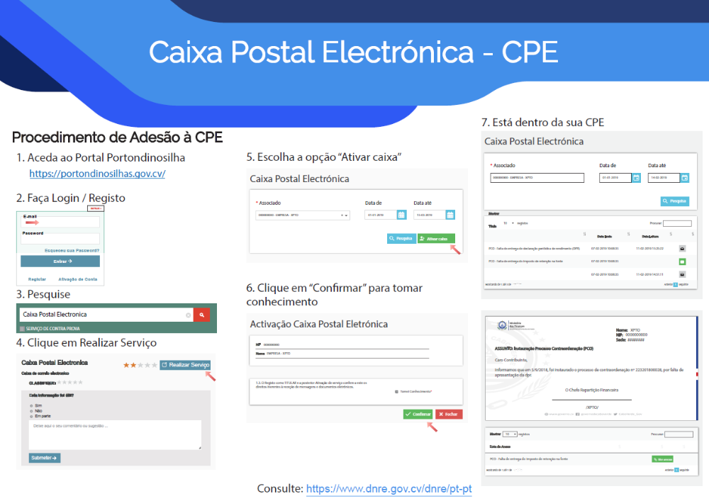A Lei estabelece que a ativação da Caixa Postal Eletrónica (CPE) é obrigatória para todos os contribuintes do Regime de Contabilidade Organizada e do REMPE (artigo 4.º do Decreto-Lei n.º 19/2015, de 19 de março) e a sua autenticação prévia deverá ser feita, gratuitamente, no Portal do Cidadão – www.portondinosilha.cv .
