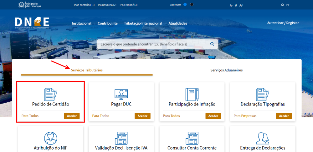 A partir de agora, as certidões anteriormente requeridas apenas presencialmente, podem ser solicitadas, de forma cómoda e segura, no www.dnre.gov.cv , através de um clique no cartão de serviço ”Pedido de Certidão”, na área “serviços tributários”