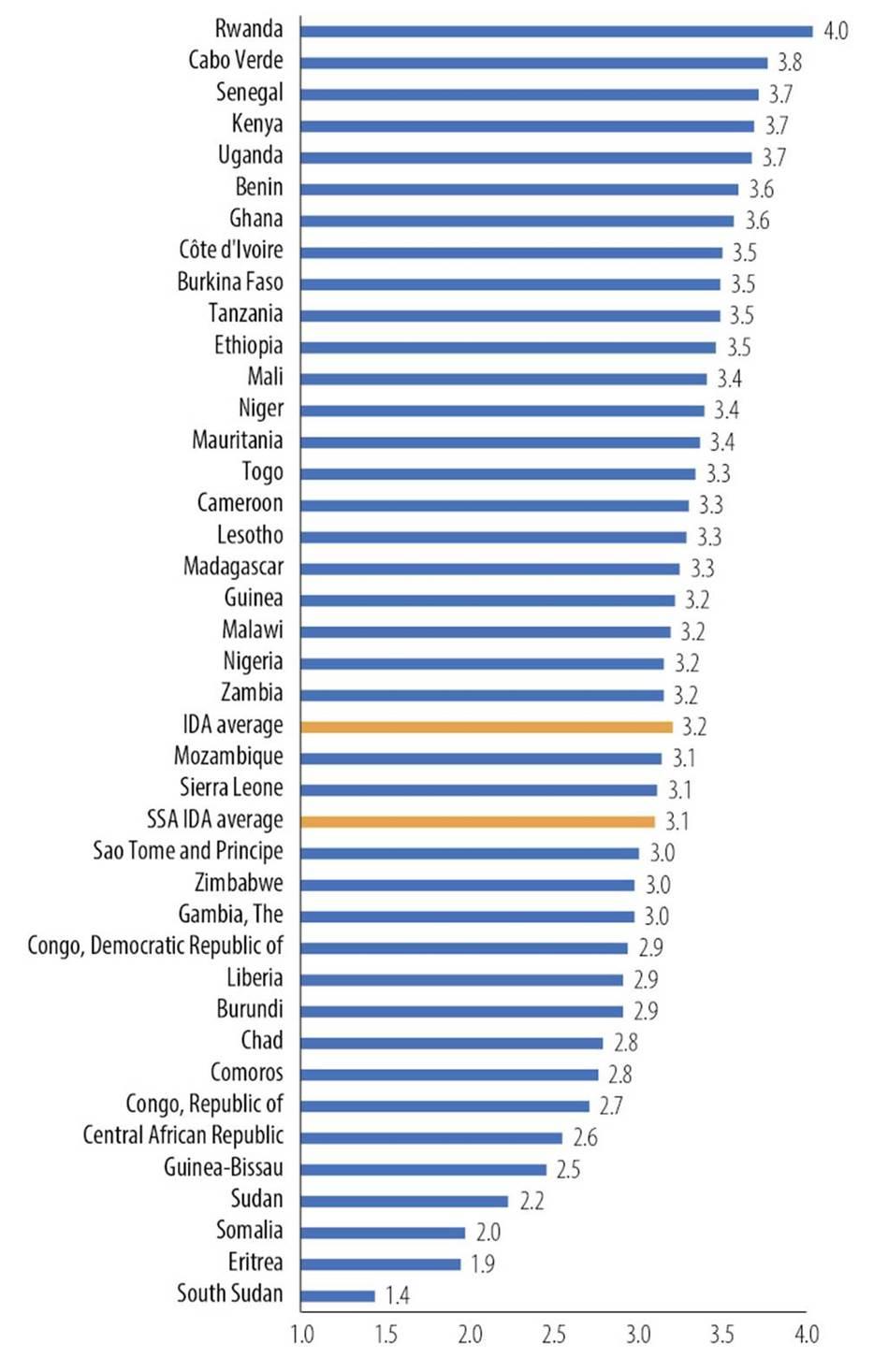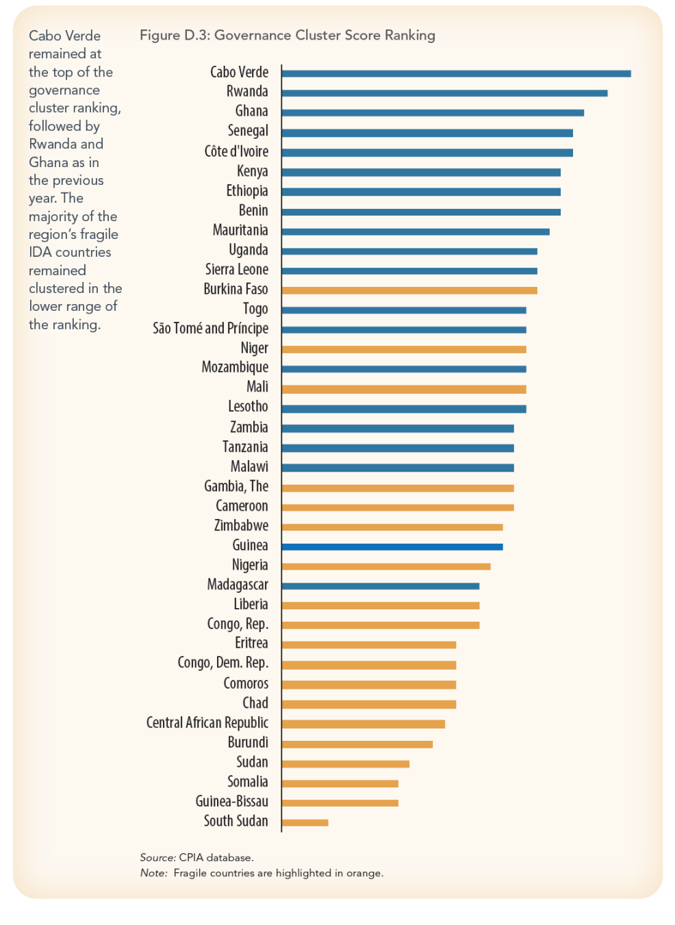 Os países com maior pontuação também permaneceram os mesmos, incluindo Cabo Verde, com uma pontuação geral de 3,8, seguido pelo Quênia, Senegal e Uganda com uma pontuação geral de 3,7. Benim e Gana viram as suas pontuações gerais aumentarem de 3,5 para 3,6. Esses países de alto escalão na escala CPIA também têm eco