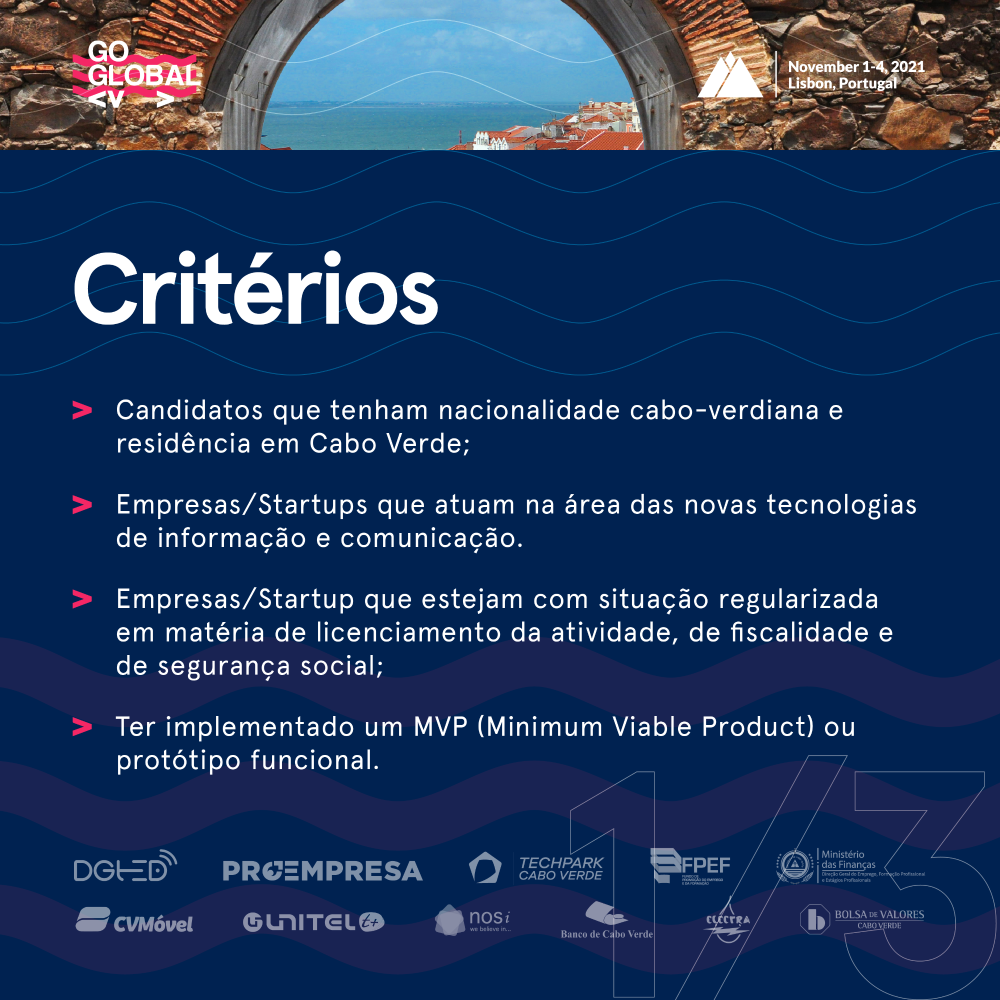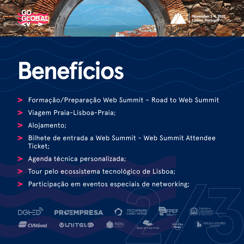 No âmbito do programa GoGlobal, o Governo de Cabo Verde, através do Programa Cabo Verde Digital e em parceria com várias entidades nacionais, lança um concurso para a seleção de projetos de base tecnológica, que irão participar no Web Summit 2021, considerada uma das maiores feiras de inovação, tecnologia e empreendedorismo do mundo, que terá como palco a cidade de Lisboa, de 01 a 04 de novembro.