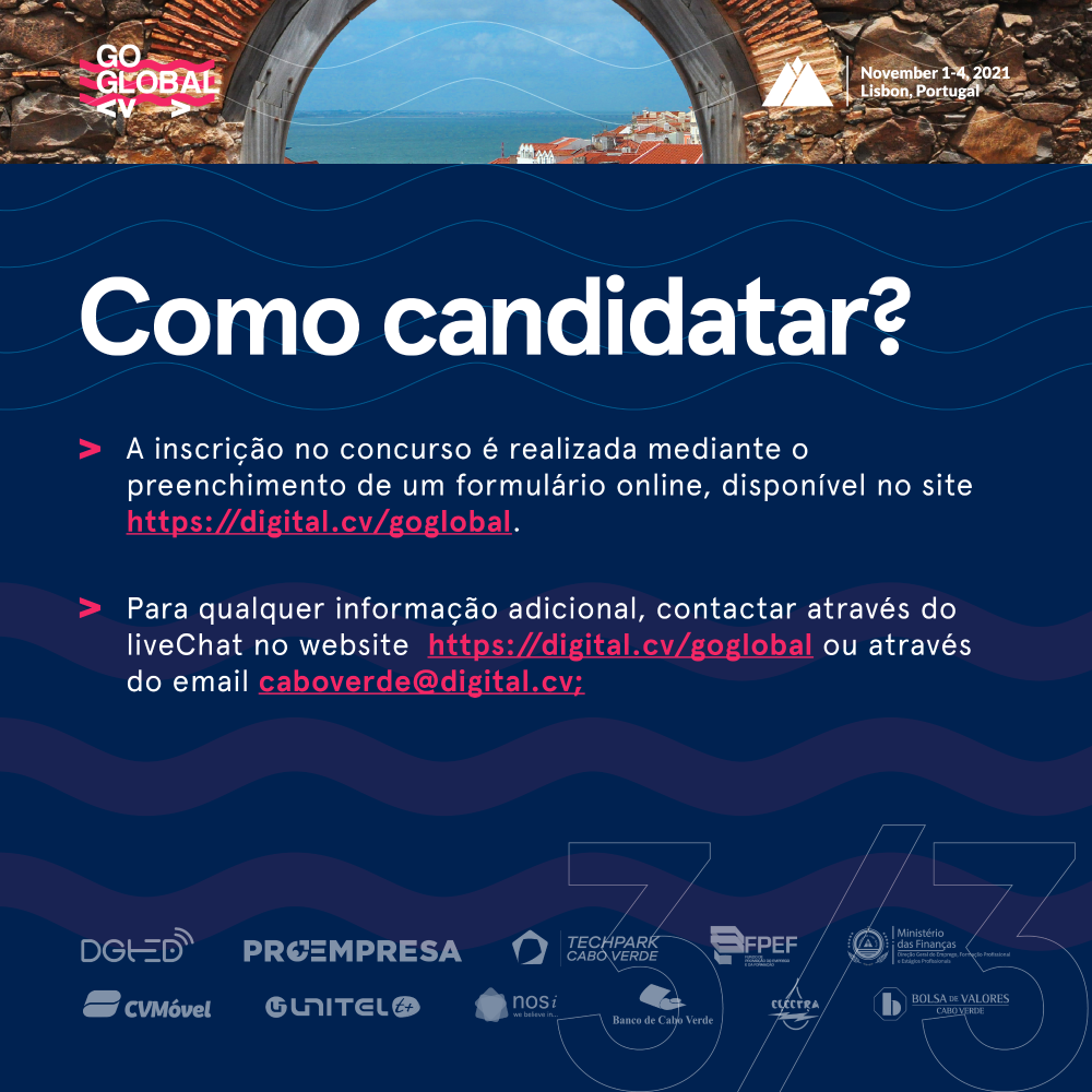 As inscrições no âmbito do presente concurso devem ser realizadas, através do preenchimento de um formulário online, no site https://digital.cv/goglobal/, de 15 de setembro a 01 de outubro de 2021. Mais informação sobre o referido concurso poderá ser obtida no website oficial, que dispõe de sistema de Live Chat, durante 24h/7.