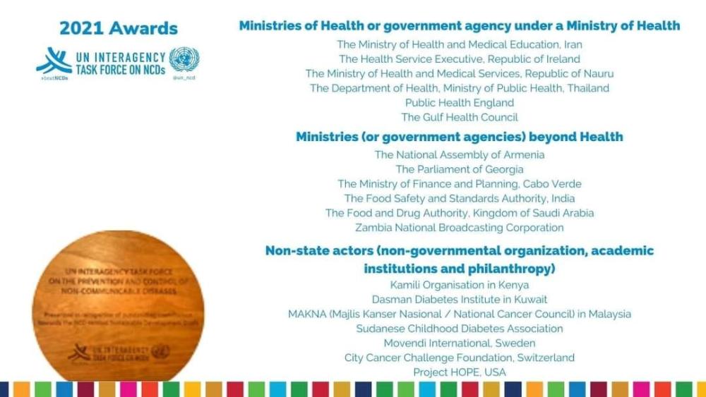 O Prémio atribuído a Cabo Verde foi anunciado na quarta-feira, 22 de setembro de 2021, na Assembleia Geral da ONU, que foi realizada virtualmente pelo Grupo de Trabalho Interinstitucional das Nações Unidas para a Prevenção e Controle de Doenças Não Transmissíveis.