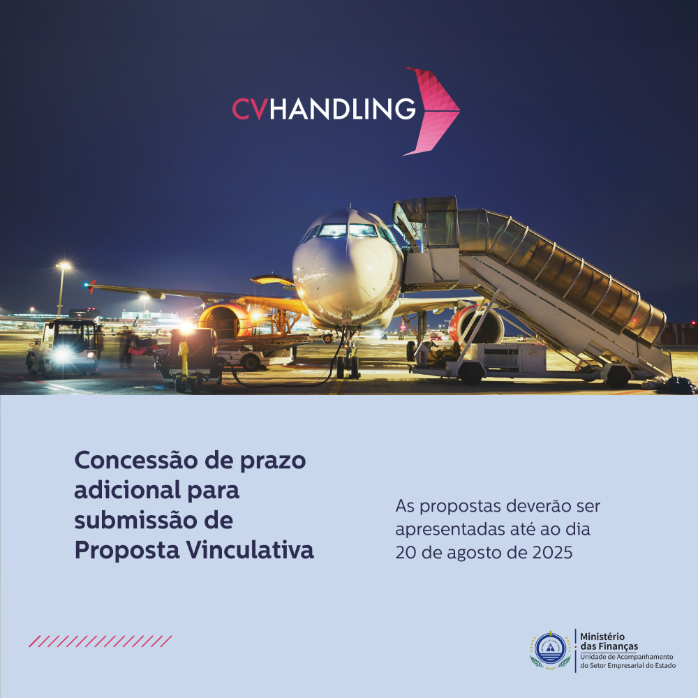 No âmbito do procedimento de concurso limitado com publicidade internacional, para seleção de um parceiro estratégico para a aquisição de até 51% do capital social da Cabo Verde Handling, de acordo com as regras estabelecidas no Caderno de Encargos, aprovado pelo Decreto-Lei n.º 31/2020, de 23 de março, serve o presente para informar que 𝐟𝐨𝐢 𝐝𝐞𝐭𝐞𝐫𝐦𝐢𝐧𝐚𝐝𝐚 𝐚 𝐜𝐨𝐧𝐜𝐞𝐬𝐬𝐚̃𝐨 𝐝𝐞 𝐮𝐦 𝐩𝐫𝐚𝐳𝐨 𝐚𝐝𝐢𝐜𝐢𝐨𝐧𝐚𝐥 𝐝𝐞 𝟔𝟎 (𝐬𝐞𝐬𝐬𝐞𝐧𝐭𝐚) 𝐝𝐢𝐚𝐬 a contar do termo do prazo inicialmente fixado. Assim, 𝐚𝐬 𝐩𝐫𝐨𝐩𝐨𝐬𝐭𝐚𝐬 𝐯𝐢𝐧𝐜𝐮𝐥𝐚𝐭𝐢𝐯𝐚𝐬 𝐝𝐞𝐯𝐞𝐫𝐚̃𝐨 𝐬𝐞𝐫 𝐚𝐩𝐫𝐞𝐬𝐞𝐧𝐭𝐚𝐝𝐚𝐬 𝐚𝐭𝐞́ 𝐚𝐨 𝐝𝐢𝐚 𝟐𝟎 𝐝𝐞 𝐚𝐠𝐨𝐬𝐭𝐨 𝐝𝐞 𝟐𝟎𝟐𝟓, nos termos previstos no Caderno de Encargos, aprovado em anexo ao Decreto-Lei n.º 31/2020, de 23 de março, e na Resolução n.º 35/2025, de 21 de maio.