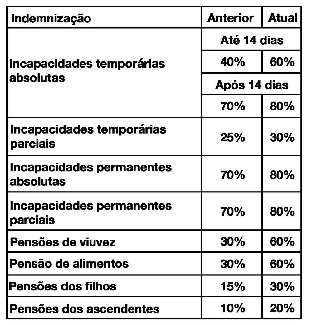 - A alteração mais significativa e com maior impacto nos segurados e/ou beneficiários prende-se com a mudança na determinação do valor do limite máximo do salário seguro mensal, tendo em conta que a anterior legislação não abrangia o salário efetivo do trabalhador, pois tinha por referência um capital de 300 ECV diários, ou seja, 9.000 ECV para 30 dias de trabalho. Por outro lado, há um aumento das prestações de indemnizações em dinheiro, através do aumento das percentagens que incidem sobre a remuneração de base, evidenciado no quadro que se segue: