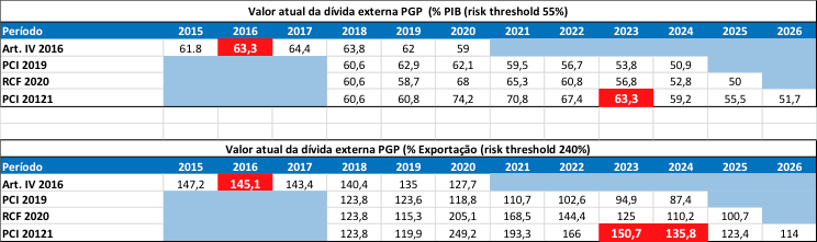Após a implementação de importantes reformas em 2017 e 2018, com efeitos claramente na melhoria dos indicadores da dívida, o FMI, na missão de 2019, menciona uma melhoria no risco da dívida pública, sendo que, pela primeira vez, em mais de 10 anos, o valor atual da dívida estaria a atingir nível inferior ao limiar do risco (55%), já em 2023 (consultar a tabela na linha PCI 2019).