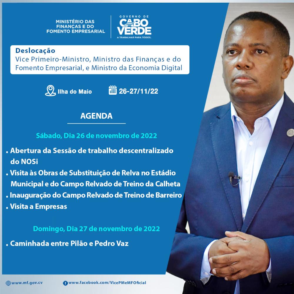 O Vice Primeiro-Ministro, Ministro das Finanças e do Fomento Empresarial, e Ministro da Economia Digital Dr. Olavo Correia, vai cumprir dois dias de visita à ilha do Maio, onde cumprirá uma importante agenda, com destaque para contatos com as empresas, para a apresentação das diferentes medidas de políticas aprovadas  no quadro Orçamento do Estado para 2023, que visam a retoma e a dinamização da economia, bem assim apresentar as medidas que vão impactar diretamente as famílias e os jovens da ilha do Maio.